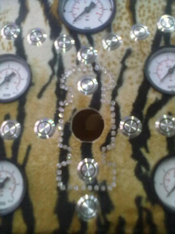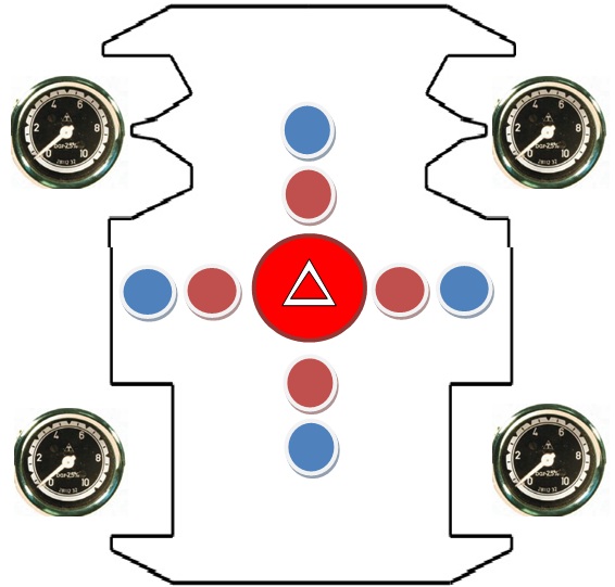 Pri originalnem sistemu me je motila predvsem skromna kontrola nad podvozjem. Za to je skrbel le en manometer, ki je prikazoval skupni tlak v sprednjem levem in desnem delu podvozja, ter skupni tlak v zadnjem levem in desnem delu podvozja. Odločil sem se, da kontrolno enoto malo razširim. Pred vsem zato, ker je na vozilu vgrajenih več pnevmatskih sklopov. Tako sem obstoječi manometer zamenjal z 5 novimi. Prvi kaže skupen tlak v rezervoarjih kompresorjev. Ostali štirje pa prikazujejo tlak v posamični zračni blazini na vsakem delu podvozja.
