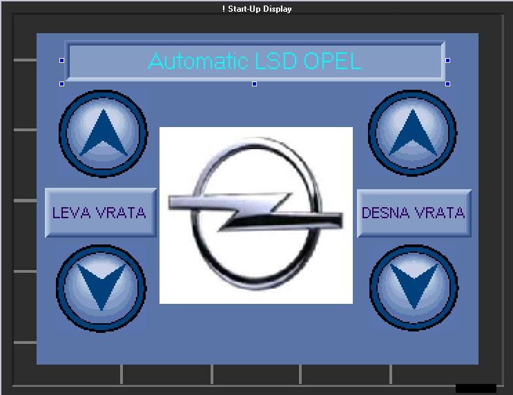 Za prikaz na zaslonu sem si omislil logotip vozila, ki je v predelavi. Na vsaki strani sem dodal dve tipki, kateri odpirata ali zapirata vrata vozila. Tako je mogoče manipulirati z vrati preko tipkal v armaturni plošči, ali preko dotika na zaslonu. Primer začetnega zaslona je prikazan na sliki 7. Na zaslonu bo prikazan tudi merilnik napetosti na akumulatorju in merilnik zračnega tlaka v kompresorju.